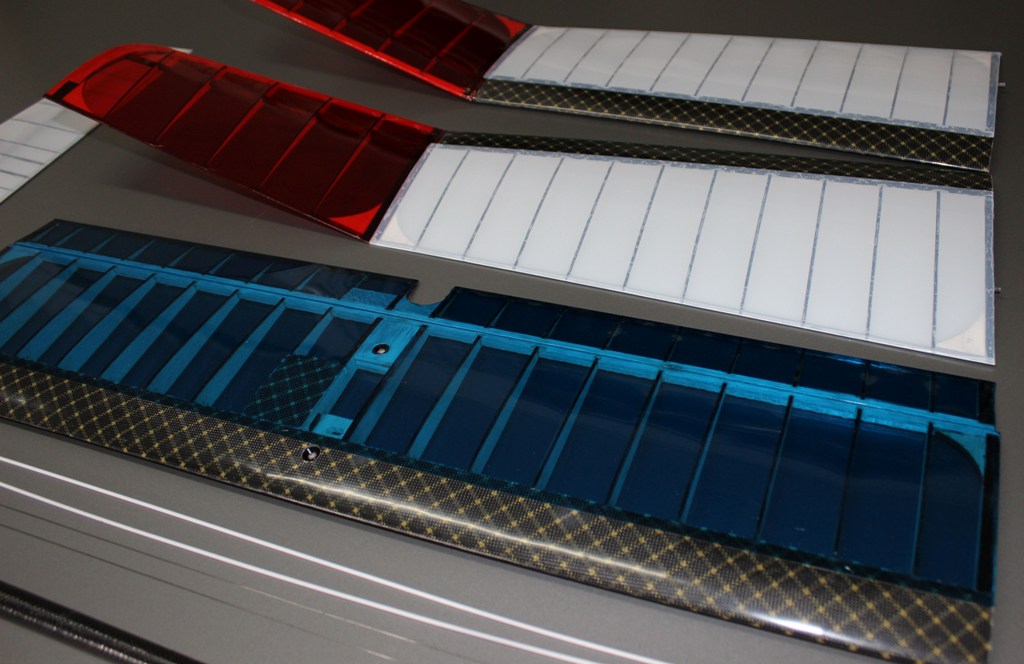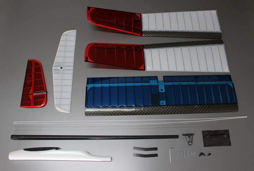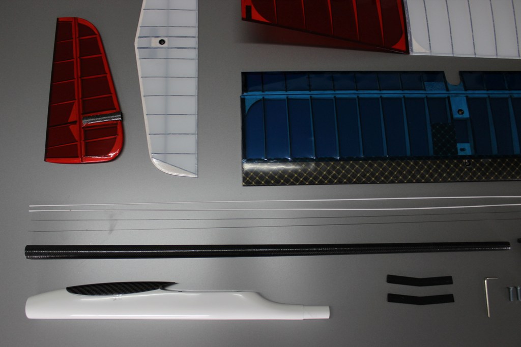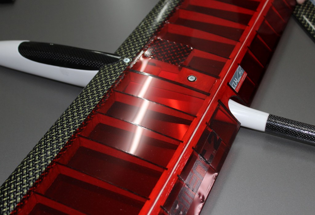 For the carbon D-Box a 1K hybrid material of highest quality is used. The main spar is made of balsa, reinforced with carbon and covered with glass. Ultimately, it is wrapped in kevlar, giving it even greater strength combined with the carbon D-Box. The trailing edge is made of carbon, and there are carbon cap strips on the upper and lower side of the ribs, which gives greater stability and more strength to the whole construction. The flaps are on the whole surface of the centroplan and it has a built-in kevlar hinge. The wings and the tail are covered with high quality Oracover Oralight trasparent foil which weighs only 36g/m2.