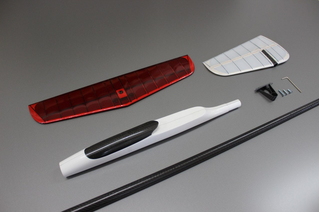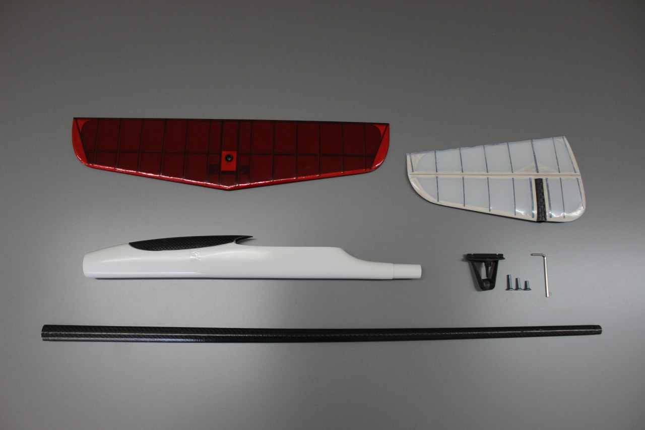 Fuselage set contains electric glass fabric pod #120, carbon tailboom, V-mount and completed tail set.