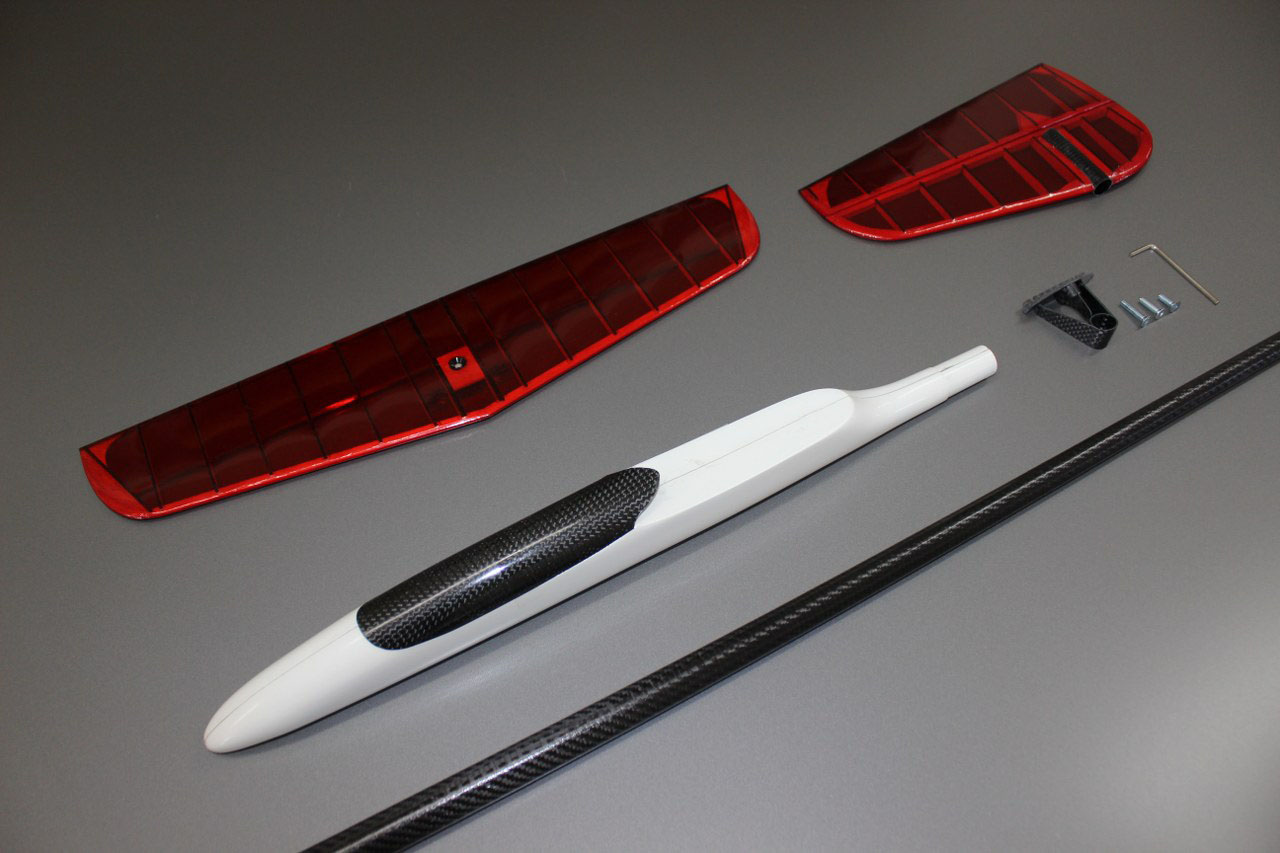 Fuselage set contains pure glider glass fabric pod #120, carbon tailboom, V-mount and completed tail set.