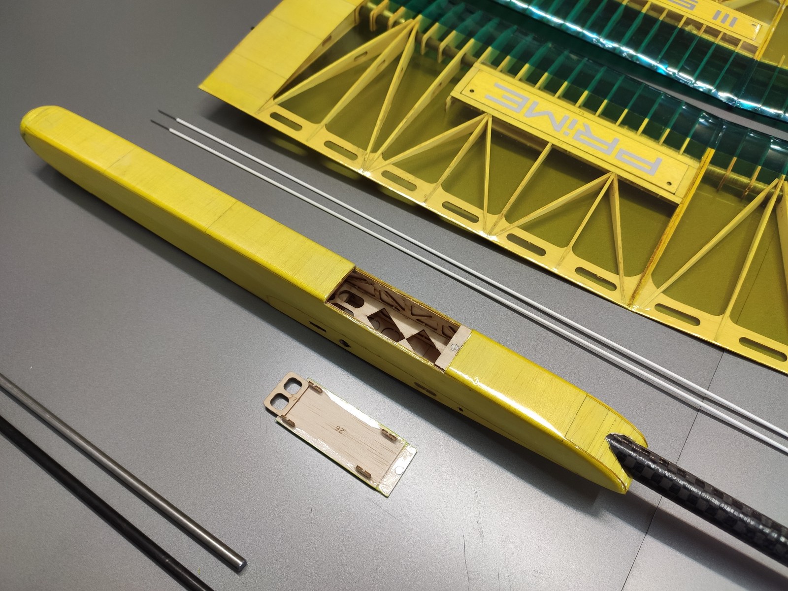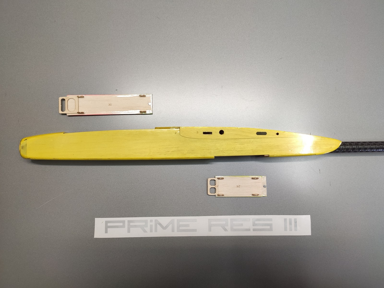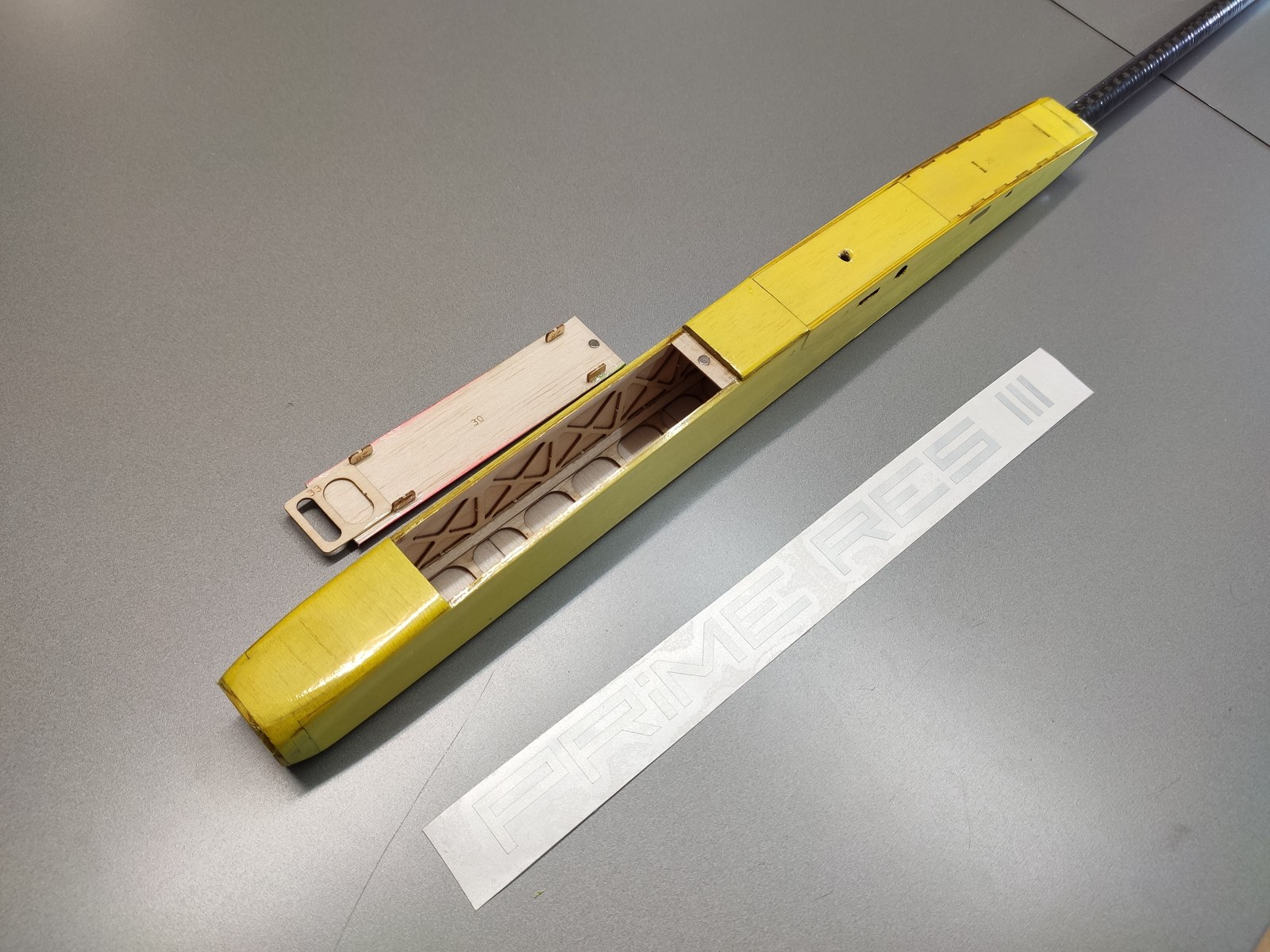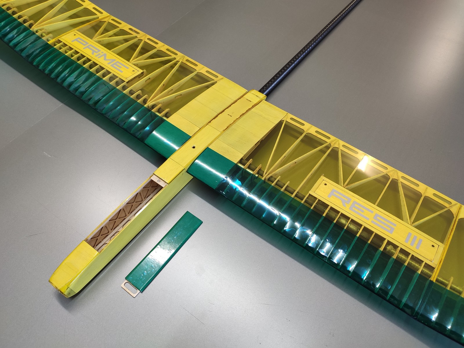 The main construction of the wings is built with full balsa ribs, plywood for trailing edge and reinforcements where needed, while composite materials are used for leading edge and mainspar according to FAI F3 RES rules.