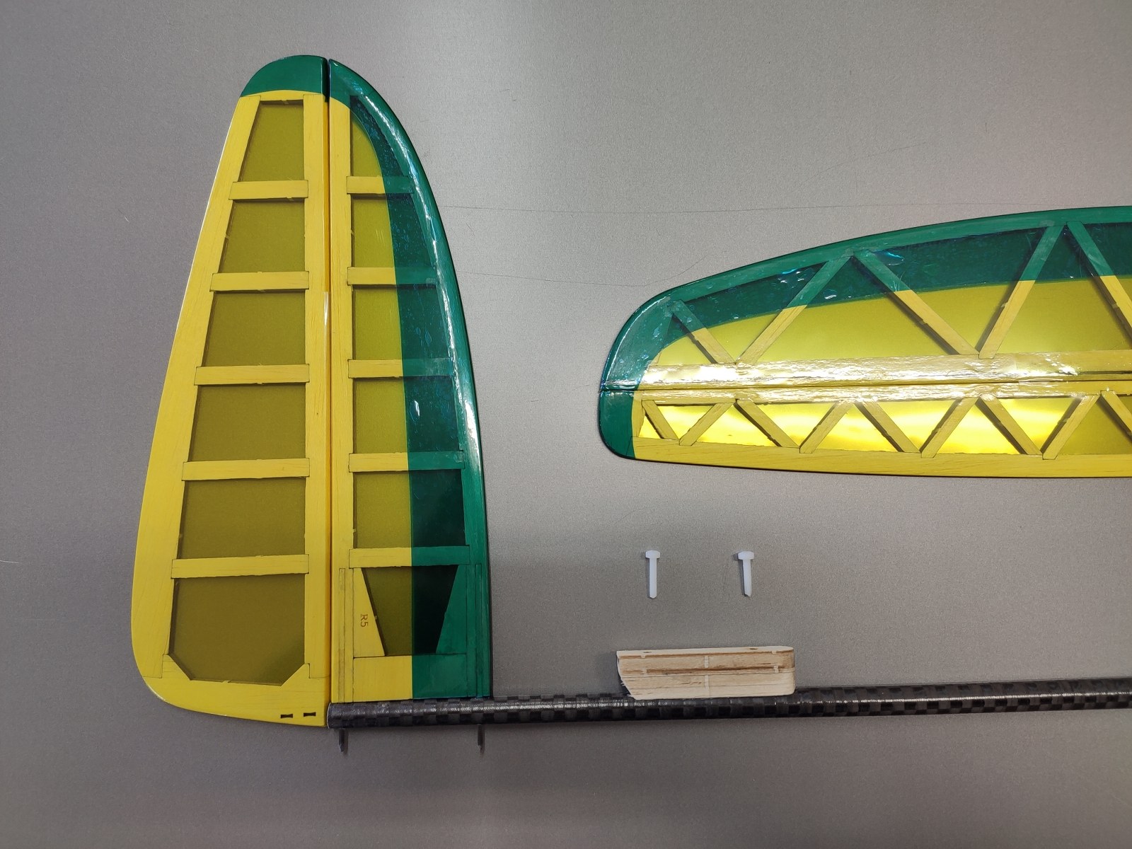 Vertical fin has pre-prepared carbon pins which are inserted into drilled tailboom and is easily tied to the fuselage.
