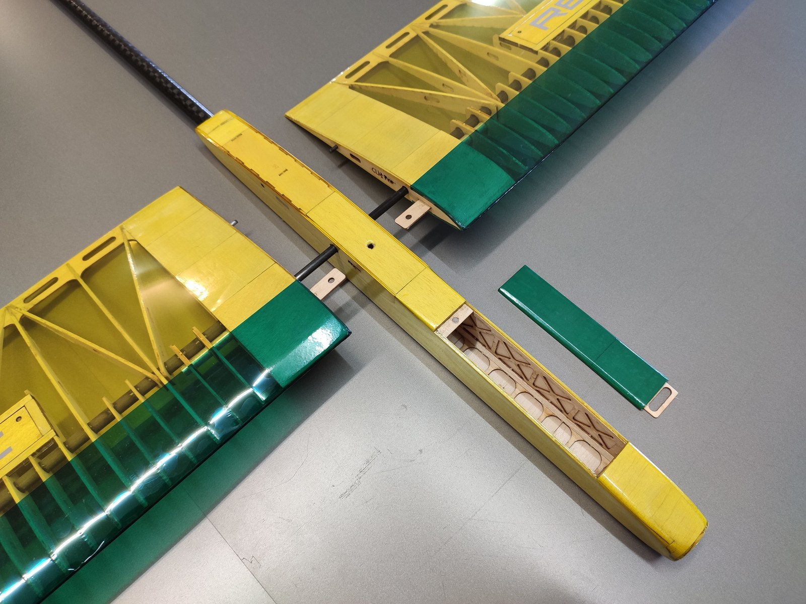 To ensure even stronger connection and to transfer the load better from middle panels of the wing onto the center panel, a wing carbon joiner made at an angle is included to connect the wing components together.