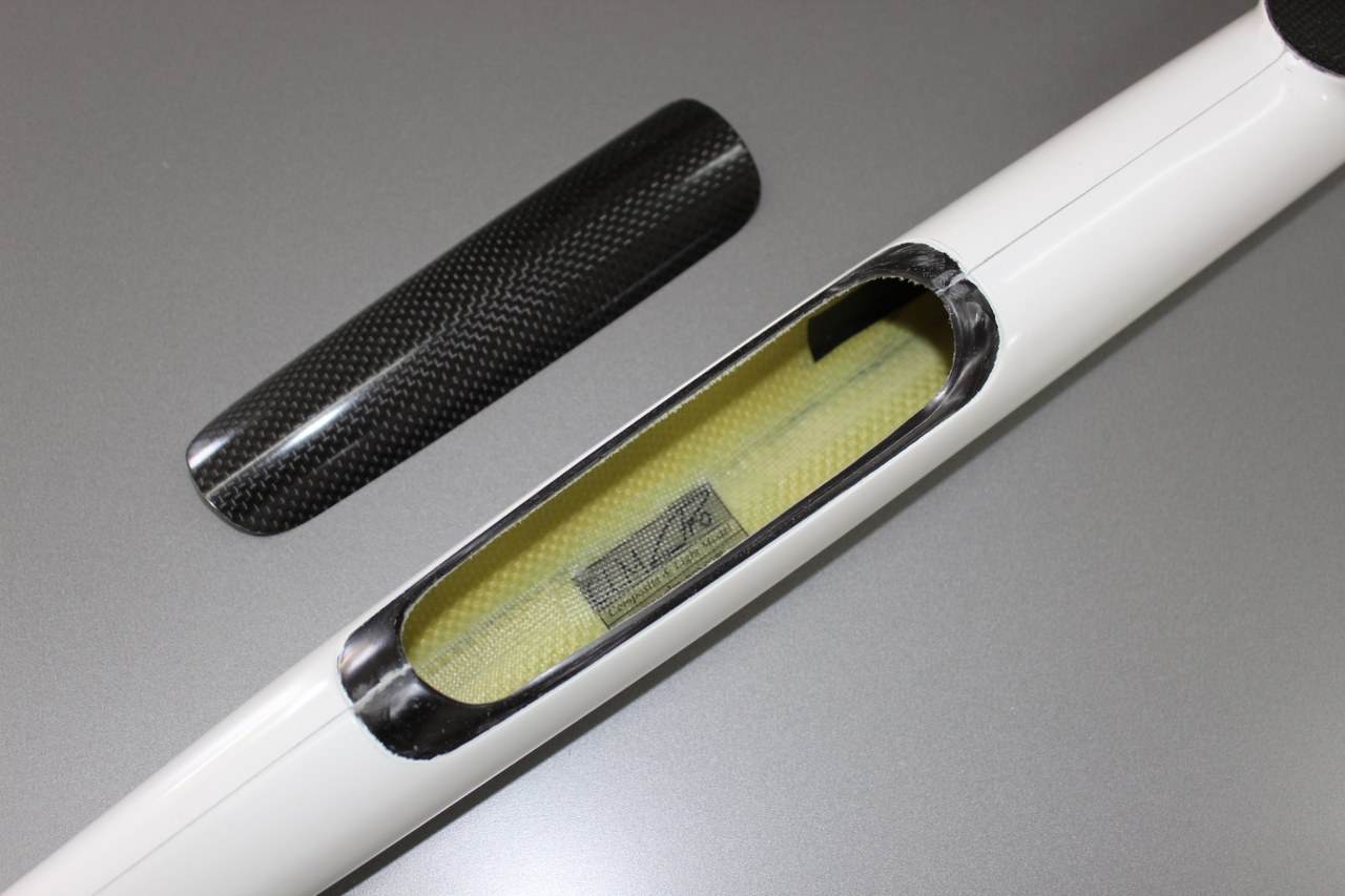 The pylon is 168 mm / 6.61" long and additionally strengthened with multiple carbon types and layers, so the wings may be up to 260 mm / 10.23" in depth, but even larger ones can be mounted. Dihedral angle of pylon is 2° on each side.