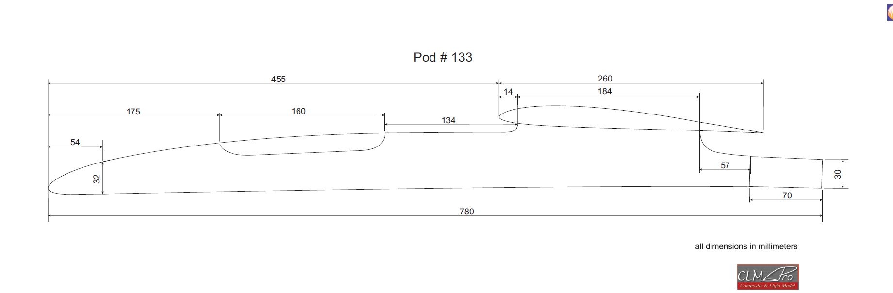 Pod #133 is the newest and largest pod we have so far produced at CLM Pro. Suitable for wingspan of up to 4m / 158". Made of fine aramid and carbon fiber. 2.4 GHz friendly.